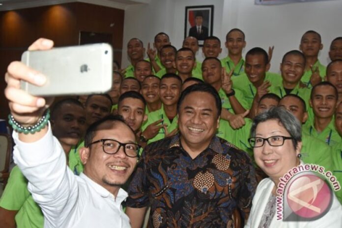 Menteri Ketenagakerjaan M. Hanif Dhakiri (kiri) berswafoto bersama Chairman Panasonic Gobel Group Rachmat Gobel (tengah) dan para peserta saat acara pelepasan peserta pelatihan magang di kantor Panasonic Manufacturing Indonesia, Jakarta Timur, Senin (30/10/2017). (ANTARA /Indrianto Eko Suwarso)
