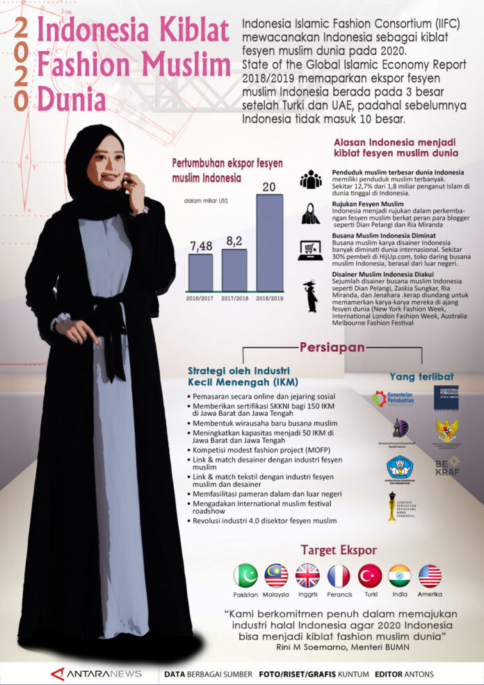 Indonesia Islamic Fashion Consortium (IIFC) mewacanakan Indonesia sebagai kiblat fesyen muslim dunia pada 2020. State of the Global Islamic Economy Report 2018/2019 memaparkan ekspor fesyen muslim Indonesia berada pada 3 besar setelah Turki dan UAE, padahal sebelumnya Indonesia tidak masuk 10 besar.