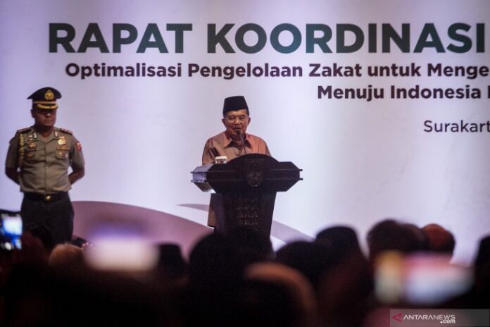 Wakil Presiden Jusuf Kalla (kanan) menyampaikan sambutannya saat meresmikan acara Pembukaan Rapat Koordinasi Nasional Zakat 2019 di Balaikota Solo, Jawa Tengah, Senin (4/3/2019).
