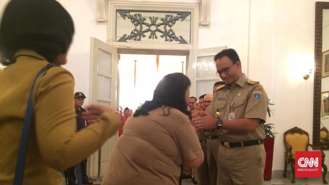 Para pegawai Pemprov DKI Jakarta sempat menunggu sekitar 15 menit agar bisa masuk ke dalam gedung Balai Kota dan bertemu Anies. Setelah masuk, Anies menyapa dan menyalami para pegawai Pemprov DKI Jakarta.