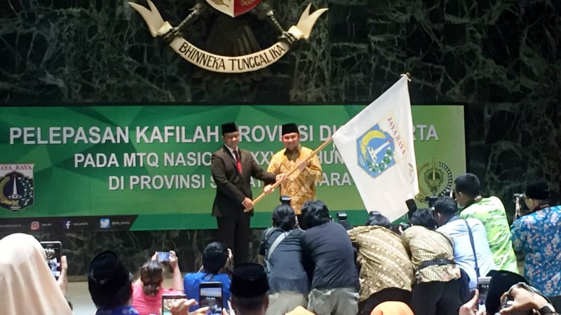 JIC – Gubernur DKI Jakarta Anies Baswedan melepas 100 kafilah (kontingen) DKI Jakarta yang akan mengikuti lomba Musabaqah Tilawatil Quran (MTQ) Nasional 2018 di Medan, Sumatera Utara. Perlombaan berlangsung pada 4-13 Oktober 2018.