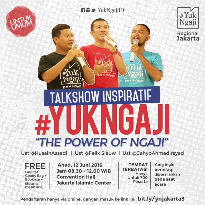 Alhamdulillah animo peserta untuk acara Talkshow Inspiratif YukNgaji begitu tinggi. Apresiasi untuk generasi muda Islam yang semakin tinggi semangat mengkaji Islam. Bagi yang sudah mendaftar untuk acara tanggal 12 di Convention Hall Jakarta Islamic Center, anda terpilih berkesempatan mengikuti event yang akan memberikan pencerahan ide, inspirasi kebaikan.