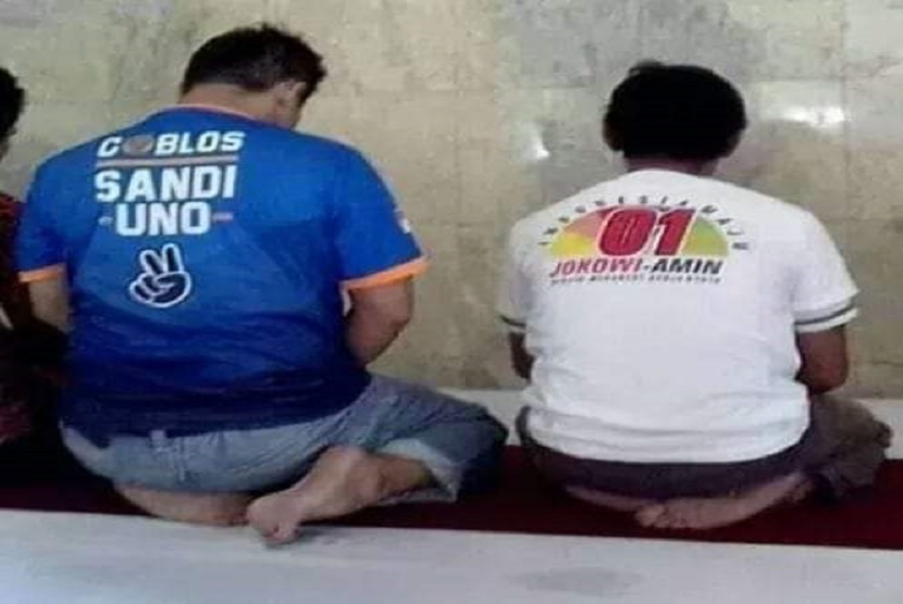 Kedua pendukung terlihat sedang menjalankan shalat. Mereka duduk bersama, tidak ada yang maju atau mundur duluan, dan saya haqqul yakin usai shalat mereka bersalaman.