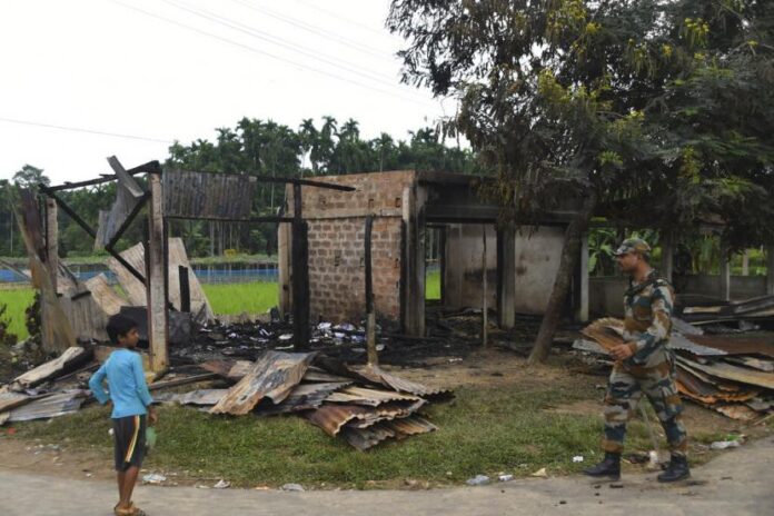 Seorang prajurit paramiliter berpatroli melewati sebuah toko yang terbakar di desa Rowa, sekitar 220 kilometer dari Agartala, di negara bagian Tripura, India, Rabu, 27 Oktober 2021.   Foto: AP/Panna Ghosh