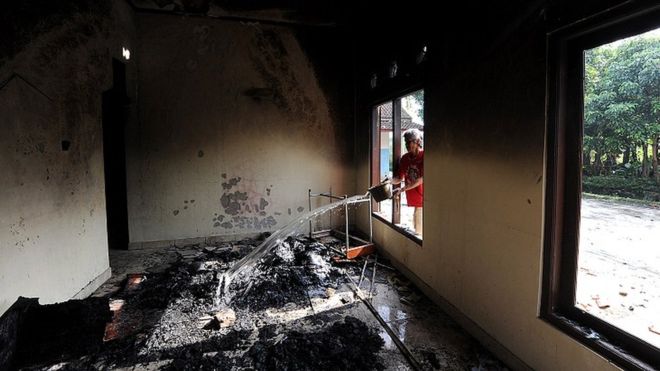 Image captionSeorang pria memadamkan api yang membakar rumah milik warga Ahmadiyah di Desa Cisalada.