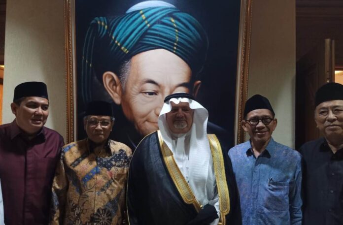 Setelah bertukar cenderamata Dubes Arab Saudi dan beberapa pengurus PBNU berfoto bersama di depan lukisan pendiri NU, Hadratussyekh KH Hasyim Asy’ari di beranda ruangan Kiai Said. (Abdullah Alawi)