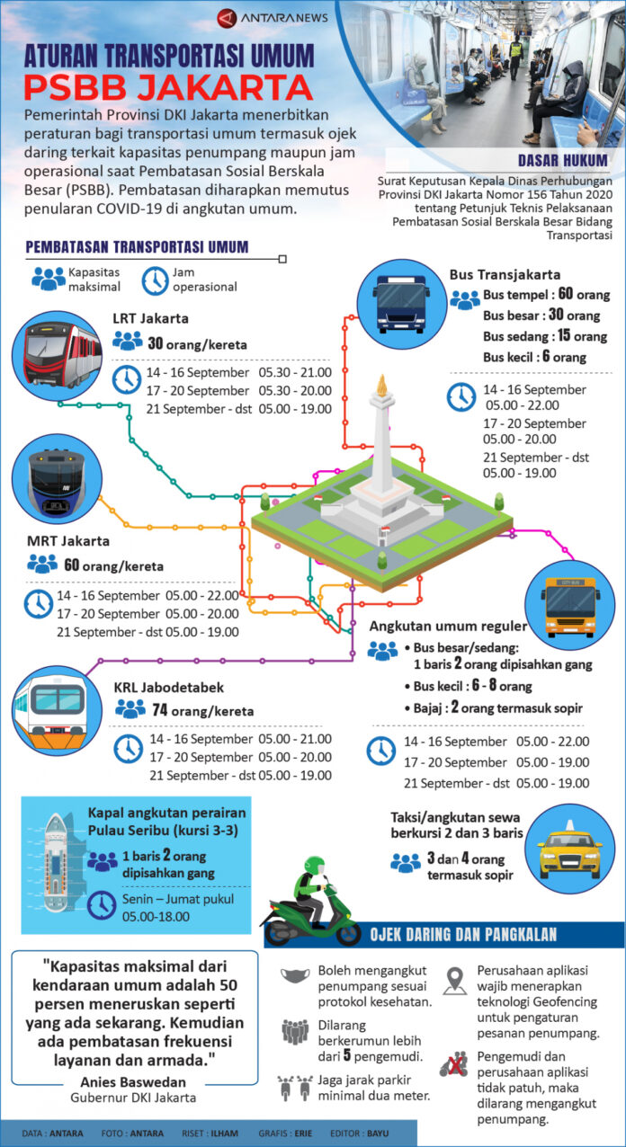 JAKARTA, JIC — Pemerintah Provinsi DKI Jakarta menerbitkan peraturan bagi transportasi umum termasuk ojek daring terkait kapasitas penumpang maupun jam operasional saat Pembatasan Sosial Berskala Besar (PSBB). Pembatasan diharapkan memutus penularan COVID-19 di angkutan umum.