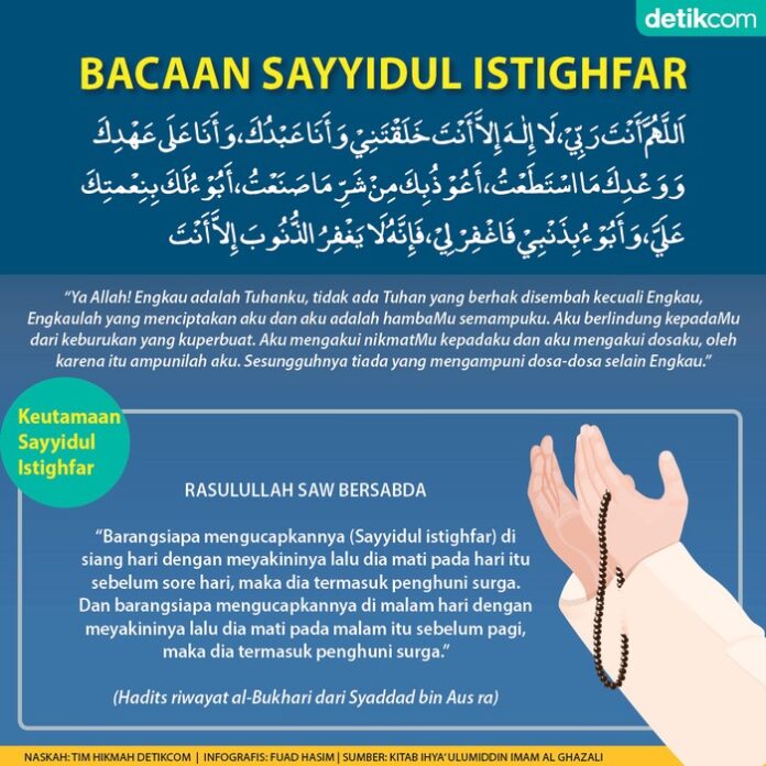 Jakarta, JICĀ – Diriwayatkan dalam Hadits Bukhari dari Syaddad bin Aus ra, Rasulullah SAW bersabda bahwa, Barangsiapa mengucapkannya (Sayyidul istighfar) di siang hari dengan meyakininya lalu dia mati pada hari itu sebelum sore hari, maka dia termasuk penghuni surga.