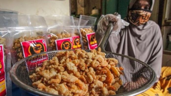 Pengusaha Usaha Mikro Kecil Menengah (UMKM) menunjukkan produk makanan olahan udang di Desa Tumpok Tengoh, Lhokseumawe, Aceh, Rabu (05/08/2020).