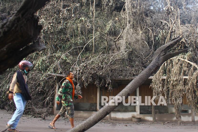 Dua pejalan kaki melintas jalur Malang-Lumajang yang terhalang pohon roboh di Pronojiwo, Lumajang, Jawa Timur, Ahad (5/12/2021). Derasnya guyuran hujan abu vulkanik akibat erupsi gunung Semeru membuat pohon di sepanjang jalur tersebut roboh dan menghalangi jalan. Foto: Antara/Ari Bowo Sucipto