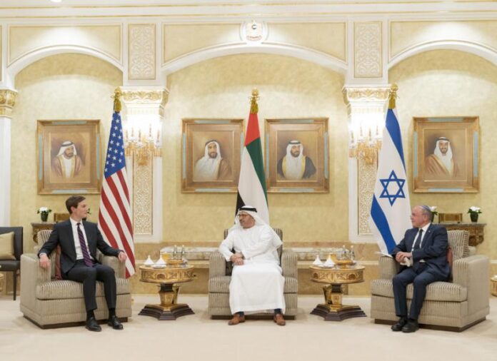 Menlu UEA Anwar Mohammed Gargash (tengah), penasihat senior Gedung Putih Jared Kushner (kiri), dan penasihat keamanan nasional Israel Meir-Bin Shabbat (kanan) di Abu Dhabi. Washington akan pertahankan keunggulan militer Israel dan majukan hubungan dengan UEA. Foto: EPA