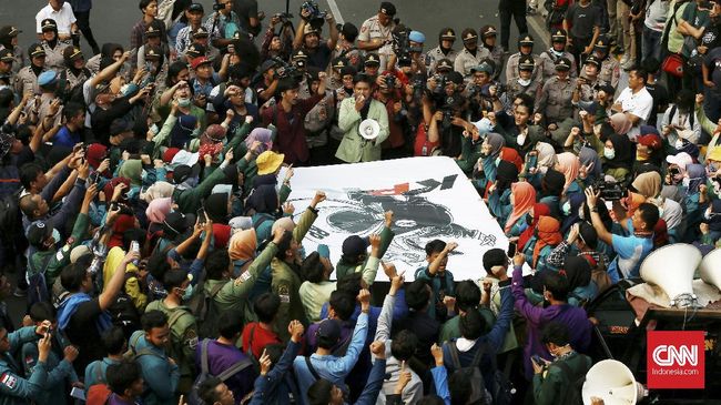 Aksi puluhan mahasiswa di kawasan patung kuda menuntut perppu UU KPK segera diterbitkan oleh Presiden berakhir damai. Jakarta. Kamis 17 Oktober 2019. (CNN Indonesia/Andry Novelino)