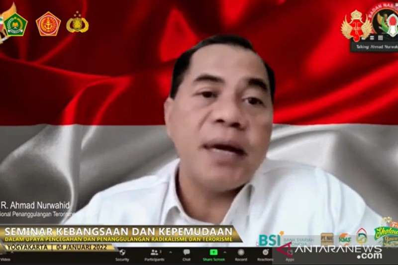 Tangkapan layar Direktur Pencegahan Badan Nasional Penanggulangan Terorisme (BNPT) Brigjen Pol R Ahmad Nurwakhid dalam seminar kebangsaan dan kepemudaan bertajuk “Upaya Pencegahan dan Penanggulangan Radikalisme dan Terorisme” yang disiarkan langsung di kanal YouTube MT Darul Hasyimi Jogja, dipantau dari Jakarta, Selasa (4/1/2022). ANTARA/Tri Meilani Ameliya