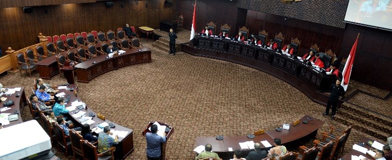 Anggota Komisi III DPR RI Muslim Ayub (tengah) memberikan keterangan pada sidang gugatan UU Jaminan Produk Halal (JPH) di Mahkamah Konstitusi, Jakarta, Kamis (20/7).