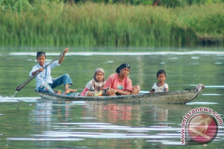 Beberapa anak yang akan pergi mengaji ditemani orang tuanya menggunakan sampan menyeberangi Sungai Muaro Anai, Padang, Sumbar, Rabu (12/12). Sejumlah warga setiap hari menggunakan sampan dari rumahnya di Desa Talao Mundam, Kec. Batang Anai, Kab. Padangpariaman, untuk pergi ke desa terekat di Padangsarai, Kec. Koto Tangah, Padang. (ANTARA/Iggoy el Fitra)