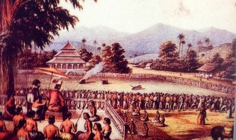 Sultan Mataram tengah menggelar acara rampokan (adu macan melawan manusia).     Foto: Sampul Buku Penaklukan Jawa karya Major Wilia