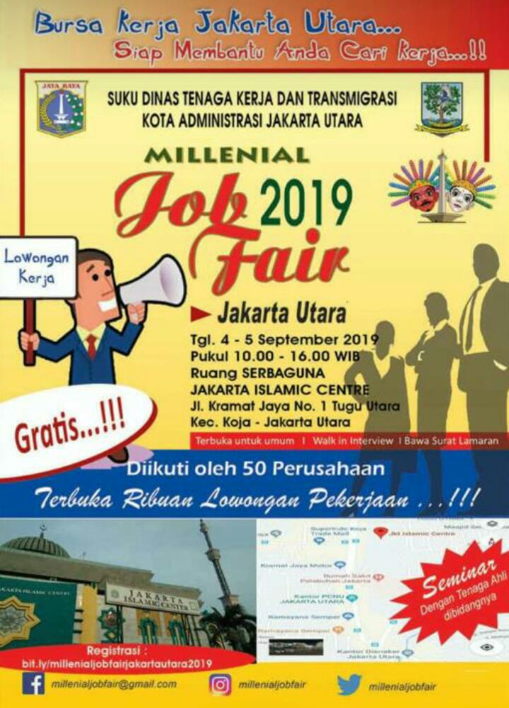 Job fair ini akan berlangsung selama dua hari dimulai hari Rabu 4 September 2019 sampai 5 September 2019. Para pencari kerja tidak dipungut biaya alias gratis.