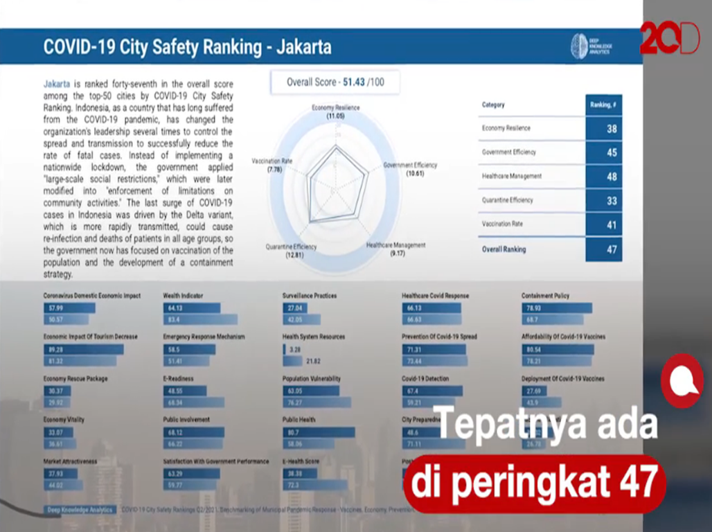 Beruntungnya warga Jakarta karena Jakarta masuk dalam jajaran top 50 kota dengan respons pengendalian Covid-19 terbaik. DKI Jakarta menjadi salah satu kota yang masuk daftar “Covid-19 City Safety Ranking Q2/2021” yang dikeluarkan oleh Deep Knowledge Analytics (DKA), sebuah badan analitik yang berbasis di London. DKA menyusun daftar kota di seluruh dunia dengan respons atau tingkat penanganan COVID-19 terbaik di dunia. DKA meneliti 114 variabel di lima kategori respons pandemi yakni ketahanan ekonomi, pemerintahan, perawatan kesehatan, karantina, dan vaksinasi. (detik.com, 11/11/2021)