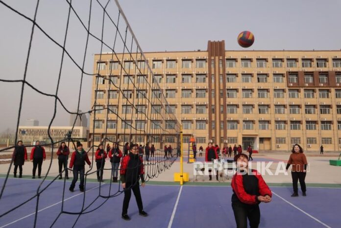 Para peserta didik kamp pendidikan vokasi etnis Uighur di Kota Kashgar, Daerah Otonomi Xinjiang, Cina, berolahraga di lapangan voli pelataran asrama, Jumat (3/1/2019). Foto: ANTARA FOTO/M. Irfan Ilmie