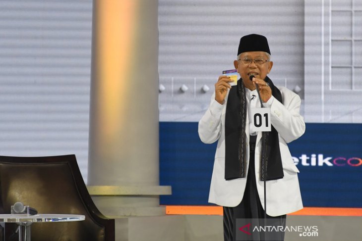 Cawapres nomor urut 01 K.H. Ma’ruf Amin memaparkan visi dan misi saat mengikuti Debat Capres Putaran Ketiga di Hotel Sultan, Jakarta, Minggu (17/3/2019).