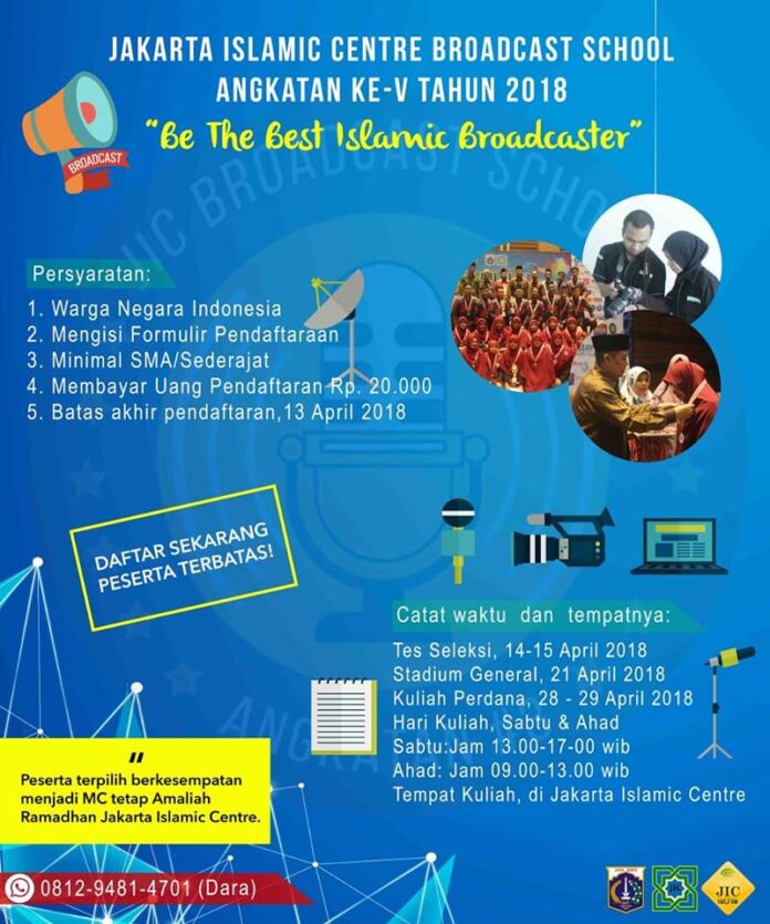 JIC – Jakarta Islamic Broadcast School angkatan ke 5 FULL BEASISWA kembali di buka dengan persyaratan dan ketentuan yang berlaku yakni :