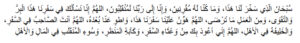 Maha suci Allah yang telah menundukkan (pesawat) ini bagi kami, padahal sebelumnya kami tidak mampu menguasainya, dan sesungguhnya kepada Allah lah kami kembali. Ya Allah, sesungguhnya kami memohon kebaikan dan takwa dalam perjalanan ini, kami mohon perbuatan yang Engkau ridloi. Ya Allah, permudahkanlah perjalanan kami ini, dan dekatkanlah jaraknya bagi kami. Ya Allah, Engkaulah pendampingku dalam bepergian dan mengurusi keluarga. Ya Allah, aku berlindung kepada-Mu dari kelelahan dalam bepergian, pemandangan yang menyedihkan dan kepulangan yang buruk dalam harta dan keluarga.