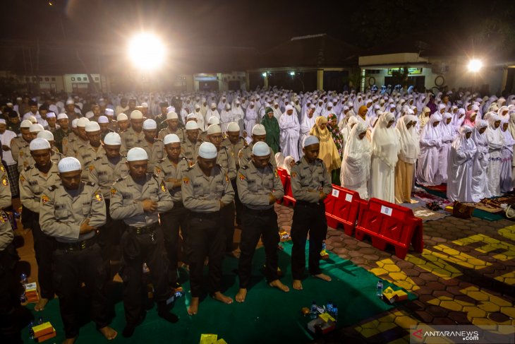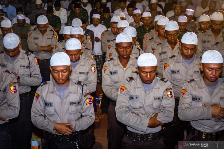 JIC, JAKARTA–Sejumlah polisi melaksanakan salat hajat saat mengikuti Tablig Akbar dan Mujahadah Kubro bertajuk Nihadlul Mustagfirin di Mapolres Demak, Jawa Tengah, Senin (18/2/2019) malam. Kegiatan salat hajat dilanjutkan doa bersama yang diikuti jajaran TNI-POLRI dan masyarakat Demak itu untuk mewujudkan Pemilu 2019 yang aman, damai, dan sejuk di Kabupaten Demak serta di seluruh wilayah NKRI. ANTARA FOTO/Aji Styawan/pras.