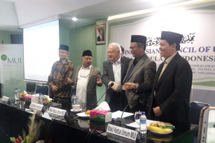 Pertemuan Duta Besar Australia untuk Indonesia Gary Quinlan (tengah) dengan para pejabat MUI, di Kantor MUI, Jakarta, Selasa (19/3/2019). (ANTARA/ Anita Permata Dewi)