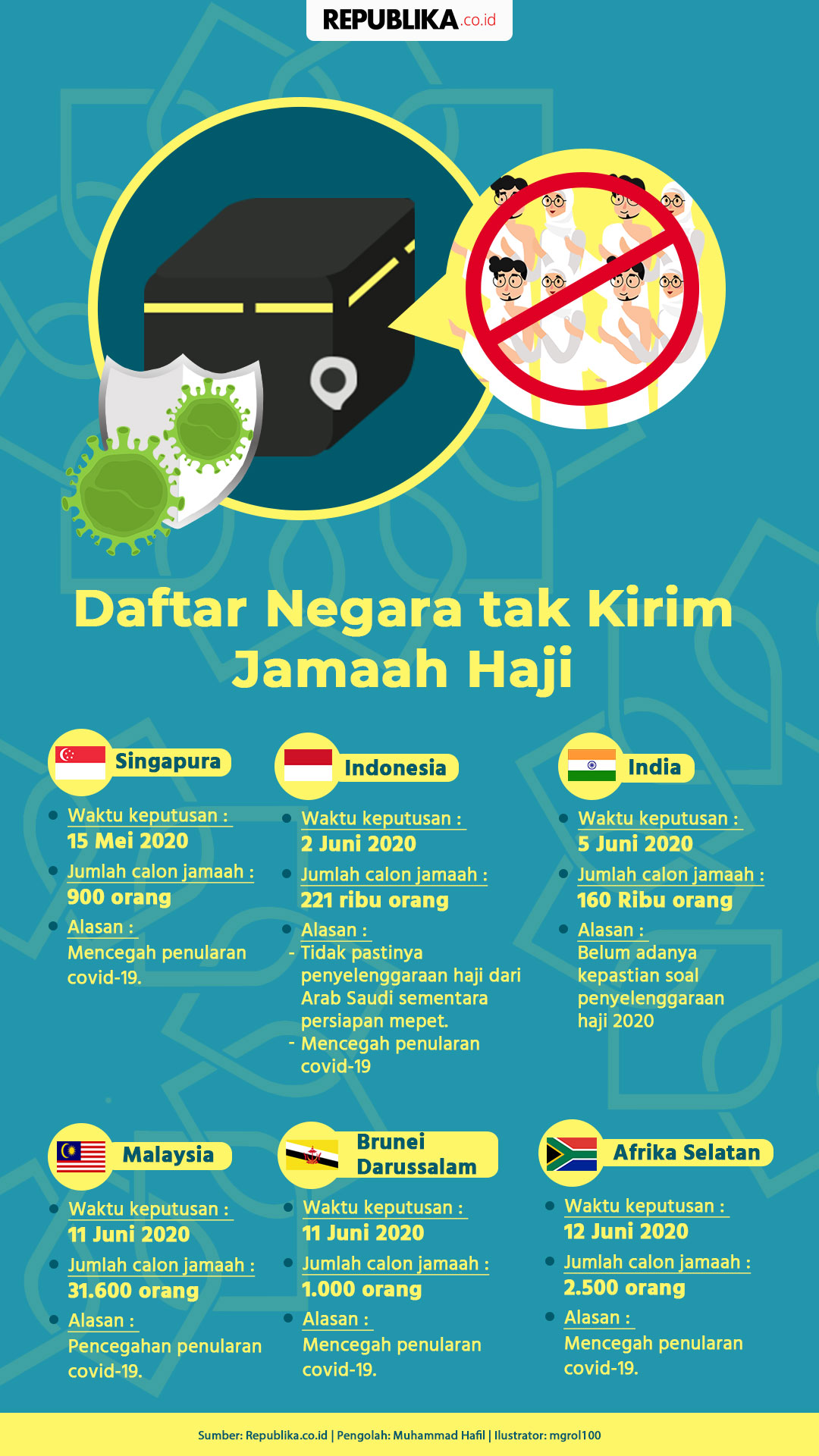 JIC – Hingga berita ini dibuat, setidaknya ada enam negara yang memutuskan untuk tidak mengirim umat Muslim-nya melaksanakan haji tahun ini. Keputusan ini dibuat di tengah pandemi Covid-19 yang sedang berlangsung. Ibadah haji merupakan ritual keagamaaan atau ziarah terbesar bagi umat Islam. Sejauh ini telah diklaim korban meninggal akibat Covid-19 mencapai 430.530 orang, termasuk 972 di Arab Saudi.