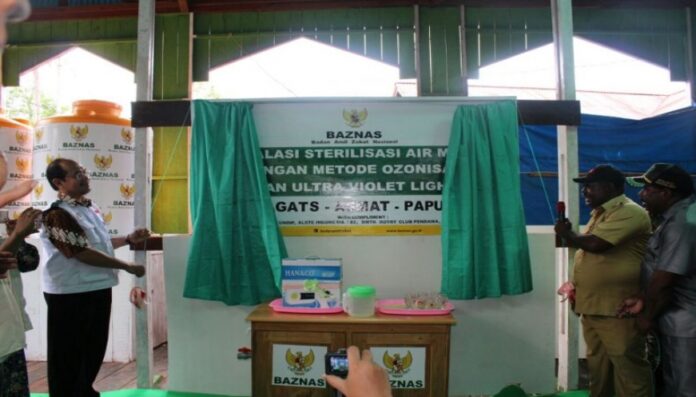 JIC – Instalasi sterilisasi air minum di area Masjid An Nur, Distrik Agats, Kabupaten Asmat, Papua, resmi beroperasi. Program yang didanai Badan Amil Zakat Nasional (BAZNAS) dan beberapa donatur ini, diresmikan Bupati Asmat, Elisa Kambu, di Distrik Agats, Kabupaten Asmat, Provinsi Papua, Selasa (13/3). Acara peresmian dihadiri unsur muspida, pemuka agama dan tokoh masyarakat setempat.