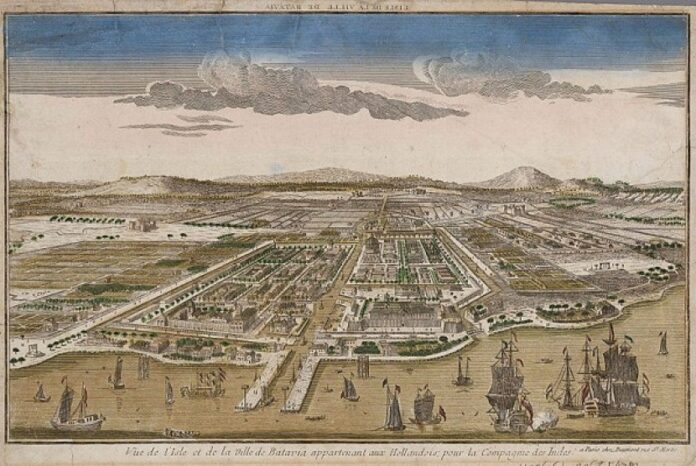 Sketsa Pelabuhan Batavia pada 1780. Saat itu Batavia beralih ke tangan penguasa Eropa setelah Malaka terlebih dulu jatuh.