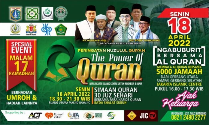 Khotmul Quran Qubro bersama para penghafal Al-Quran yang berasal dari 34 Provinsi dan 5000 jamaah lainnya dalam rangka peringatan Nuzulul Quran yang akan diselenggarakan pada: