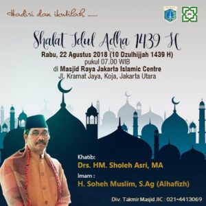 JIC – Pelaksanaan Shalat Idul Adha 1439 H Masjid Raya Jakarta Islamic Centre insya Allah akan diselenggarakan pada hari Rabu, 22 Agustus 2018 (10 Dzulhijjah 1439 H). Adapun Khatib yang akan memberikan khutbah Idul Adha, Drs. HM. Sholeh Asri, MA dan Sholat Ied bersama Imam, H. Soheh Muslim, S.Ag Al Hafizh. Marilah bersama-sama melaksanakan Shalat Idul Adha 1439 H di Masjid Raya Jakarta Islamic Centre, Jalan Kramat Jaya, Koja Jakarta Utara.