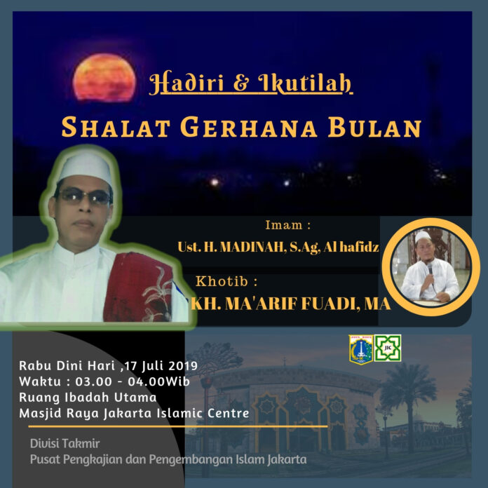 JIC – Shalat gerhana bulan diselenggarakan oleh Divisi Takmir Pusat Pengkajian dan Pengembangan Islam Jakarta (JIC) akan diselenggarakan pada :