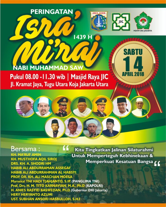 Hadiri dan ikutilah peringatan Isra’ Mi’raj Nabi Muhammad SAW 1439 H bersama KH. Ma’ruf Amin, KH. Musthofa Aqil Siroj, Drs. KH. Ahmad Shodri, HM (Kepala Badan Manajemen PPPIJ), Habib Ali Abdurrahman Al Habsyi, Prof. Dr. KH. Ali Maschan Moesa, Marsekal TNI Hadi Tjahjanto, S.IP. (Panglima TNI), Prof. Drs. H. M. Tito Karnavian, M.A., Ph.D (Kapolri), H. Anies Rasyid Baswedan, Ph.D (Gubernur DKI Jakarta), Hery Heryanto Azumi, dan Ustadz Subhan Ansori Hasbulloh, S.H.I yang insya Allah akan diselenggarakan pada :