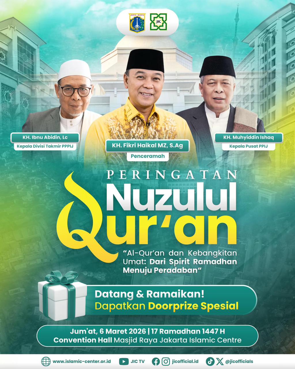Sebagai wujud syiar dan ikhtiar membumikan nilai-nilai Al-Qur’an, Masjid Raya Jakarta Islamic Centre menyelenggarakan Peringatan Nuzulul Qur’an 1447 H dengan tema: