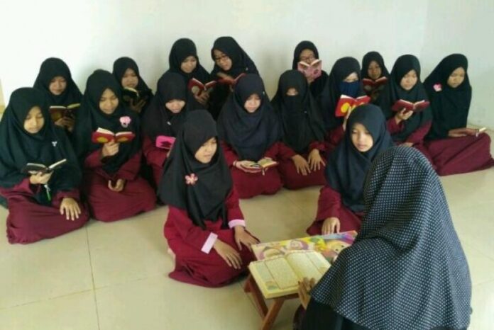 Para santri sedang menyetorkan hafalan Alquran di Takhassus Bangun Reksa.