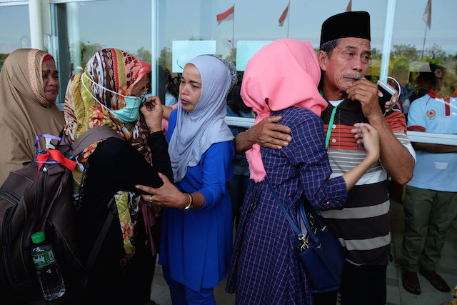 Sejumlah calon jamaah haji korban penipuan melalui jalur Filipina disambut keluarganya di Bandara Internasional Sultan Hasanuddin, Makassar, Minggu (4/9). Sebanyak 168 warga negera Indonesia korban penipuan menggunakan paspor Filipina untuk naik haji dipulangkan ke Indonesia, diantara 110 orang turun di Makassar dan 58 orang melanjutkan perjalanan menuju Jakarta setelah melalui proses keimigrasian. ANTARA FOTO/Sahrul Manda Tikupadang/pd/16