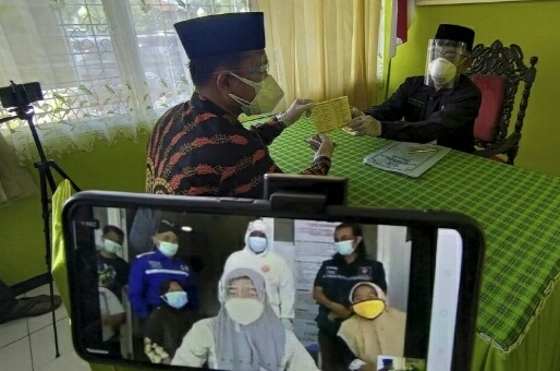 Ilustrasi – Penghulu yang bertindak sekaligus sebagai wali nikah mempelai perempuan, menyerahkan buku nikah kepada mempelai laki-laki di Kantor Urusan Agama Kecamatan Pakel, Tulungagung, Jawa Timur, Sabtu (26/12/2020). Pernikahan di tengah pandemi itu tidak dihadiri langsung mempelai perempuan karena terpapar COVID-19, sehingga hanya bisa menyaksikan prosesi akad secara virtual/daring dari asrama COVID-19. ANTARA FOTO/Destyan Sujarwoko/pras.
