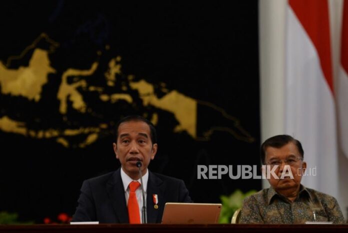 Presiden Joko Widodo dan Wakil Presiden Jusuf Kalla mengumumkan pemindahan ibukota negara di Istana Merdeka, Jakarta, Senin (26/8).   Foto: Republika/Edwin Dwi Putranto