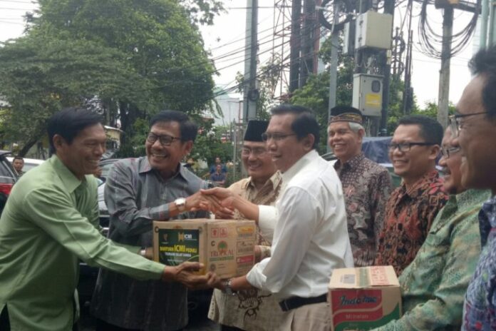 Sekretaris Jenderal ICMI Muhammad Ja’far Hafsah (dua dari kiri) menyerahkan secara simbolik bantuan untuk korban tsunami Banten di Kantor ICMI Pusat, Jakarta Timur, Jumat. (Dok ANTARA/Martha Herlinawati Simanjuntak)