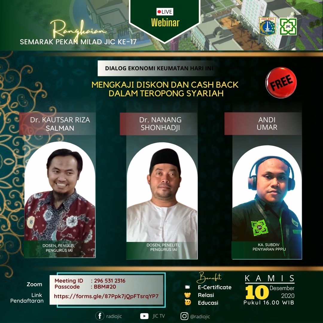 Dengan tema “Mengkaji Diskon dan Cashback Dalam Teropong Syariah” bersama narasumber Dr. Kautsar Riza Salman (Coach, Penulis, Pengurus IAI), Dr. Nanang Shonhadji (Dosen, Peneliti, Pengurus IAI), Andi Umar (Kasubdiv Penyiaran PPPIJ)