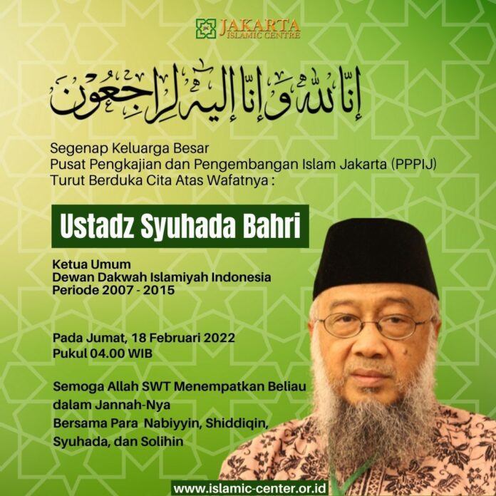 JIC- Innalillahi wa innailaihi rajiun. Kembali Allah SWT panggil Ulama sekaligus aktivis dakwah. KH. Syuhada Bahri, Ketua Umum Dewan Da’wah Islamiyah Indonesia (DDII) Periode 2007-2015 wafat menjelang Subuh, pad Jumat, 18 Februari 2022. Ia wafat setelah sebelumnya dikabarkan menjalani operasi paru-paru.