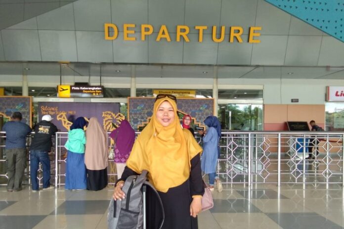 Kader Ikatan Mahasiswa Muhammadiyah (IMM) Sulawesi Selatan, Nirwana, sesaat sebelum bertolak ke Australia untuk mengikuti pertukaran tokoh pemuda Muslim Australia-Indonesia, di Bandara Sultan Hasanuddin Makassar, Kamis (13/6). (ANTARA/Nur Suhra Wardyah