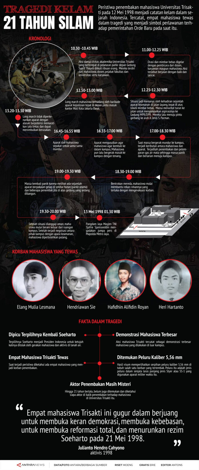 Peristiwa penembakan mahasiswa Universitas Trisakti pada 12 Mei 1998 menjadi catatan kelam dalam sejarah Indonesia. Tercatat, empat mahasiswa tewas dalam tragedi yang menjadi simbol perlawanan terhadap pemerintahan Orde Baru pada saat itu.