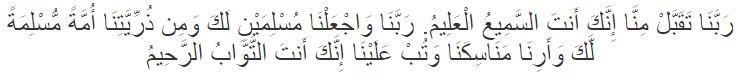 “Rabbanaa taqabbal minna innaka antassamii’ul ‘aliim. rabbanaa waj’alnaa muslimaini laka wa min dzurriyyatinaa ummatam muslimatal laka wa arinaa manaa sikanaa wa tub ‘alainaa innaka antat tawwaabur rahiim.”
