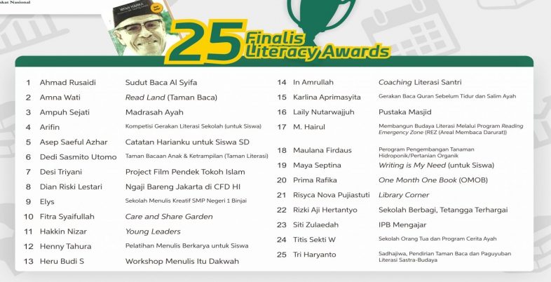Terbaik pertama program Literacy Awards diraih oleh In Amrullah dengan judul program Coaching Literacy Santri. Adapun untuk terbaik kedua diraih oleh M. Hairul dengan judul program  Membangun Literasi melalui reading emergency zone (areal membaca darurat). Dan untuk terbaik ketiga hingga kelima diraih oleh Siti Zulaedah (IPB Mengajar), Dian Riski Lestari (Ngaji Bareng Jakarta di CAR Free Day HI), dan Fitra Syaifullah (Care & share Garden).