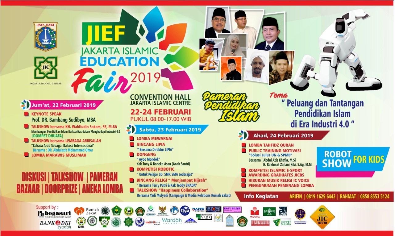 JIC – Jakarta Islamic Education Fair (JIEF) 2019 kembali hadir. Digagas oleh Divisi Pengkajian dan Pelatihan Jakarta Islamic Centre (JIC), pameran edukasi Islam ini akan berlangsung selama tiga hari yakni Jum’at sampai dengan Ahad (22-24/02) di Convention Hall JIC. Dengan tema “Peluang dan Tantangan Pendidikan Islam di Era Industri 4.0”, acara ini menyuguhkan perkembangan dunia pendidikan Islam saat ini.