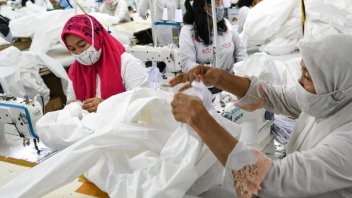 Keterangan gambar,  Pekerja perempuan memproduksi alat pelindung diri di sebuah perusahaan garmen.