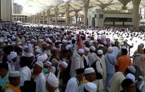 Jemaah haji dari berbagai usai melaksanakan shalat Jumat di Masjid Nabawi, Madinah